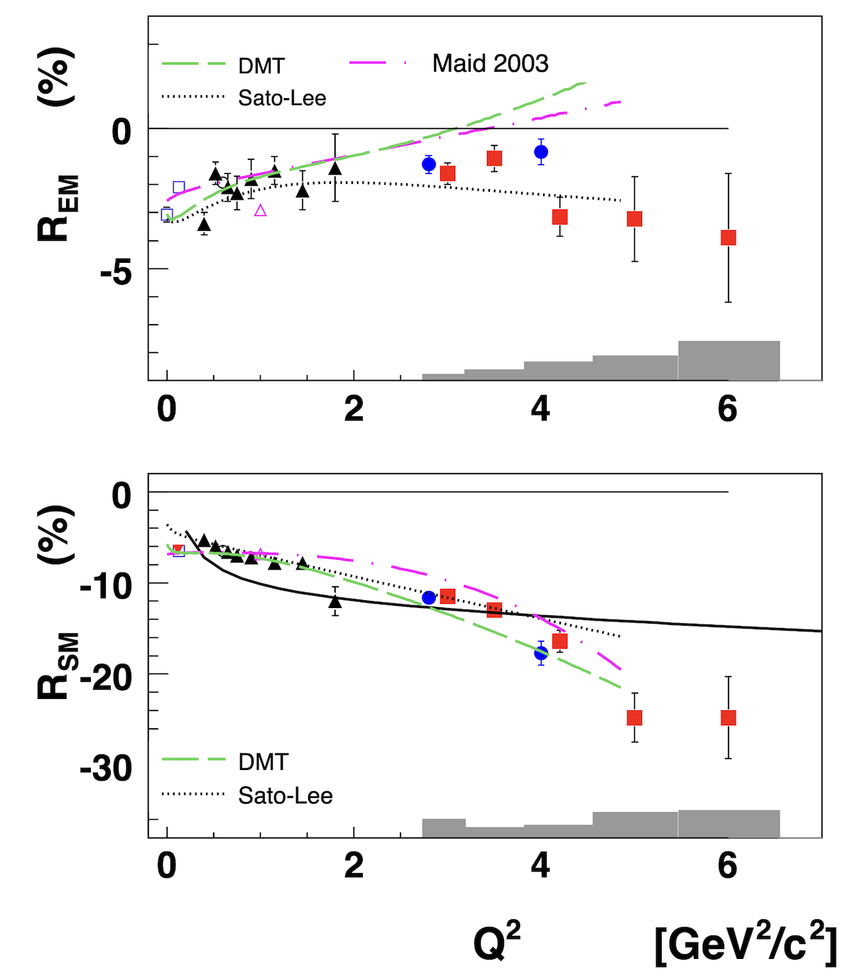 The ratios REM (upper panel) and RSM (lower panel). The filled red squares are from the current CLAS experiment utilizing the UIM. The errors shown are statistical, while estimated systematic errors are shown as gray bars at the bottom of the graph. Also shown are selected earlier published results. The filled triangles correspond to a recent analysis of previous CLAS data and the filled circles are from an earlier ]Lab Hall C experiment.